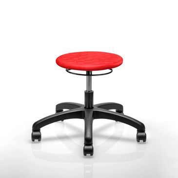 Banco giratorio bajo, asiento redondo de poliuretano tipo piel integral, mecanismo de ajuste neumático de altura, base de 5 anclas con regatones o rodajas, cuentan con rodajas con freno o bien con rodajas para ESD.