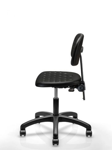 Silla giratoria baja, respaldo y asiento moldeados de poliuretano tipo piel integral, mecanismo de reclinación de respaldo, ajuste neumático de altura y base de 5 anclas con regatones o rodajas, Cuentan con rodajas con freno o bien con rodajas para ESD.