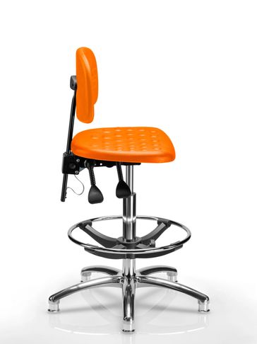 Silla giratoria alta, respaldo y asiento moldeados de poliuretano tipo piel integral, mecanismo de reclinación de respaldo, ajuste neumático de altura, base de 5 anclas con regatones o rodajas y aro descansapiés, cuentan con rodajas con freno o bien con rodajas para ESD.