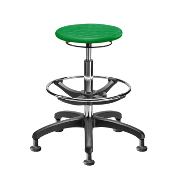 Banco giratorio alto, asiento redondo de poliuretano piel integral, mecanismo de ajuste neumático de altura, base de 5 anclas con regatones o rodajas y aro descansapiés, cuentan con rodajas con freno o bien con rodajas para ESD.
