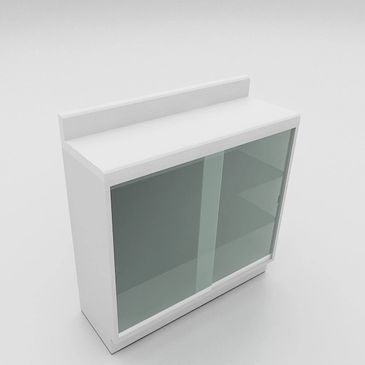 Alacena vitrina a repisa o puente central con cuatro puertas de cristal corredizas, cuenta con un entrepaño de ajuste variable con medidas de: 90, 100, 120 cm de frente con fondo de 40 cm y un altura de 60 cm.